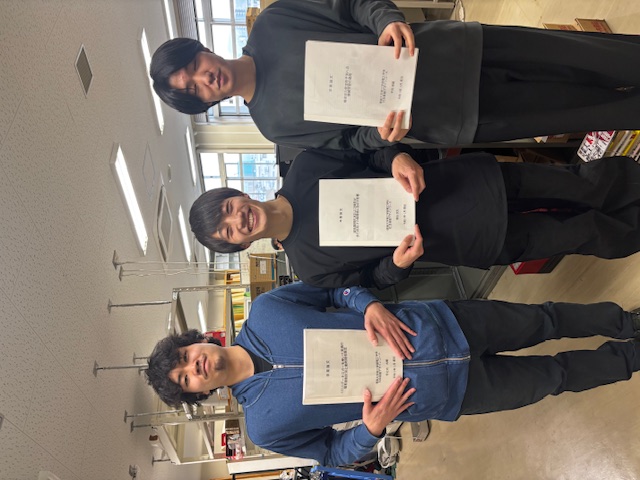 新生風工学研究室の第2期学部生,曽谷洸太君,平岡晃嗣君,芳之内大輔君の3名が無事に卒業論文を完成させ,再提出を終えました。どうもお疲れ様でした。題目は以下の通り。卒業後の益々の活躍を期待します。